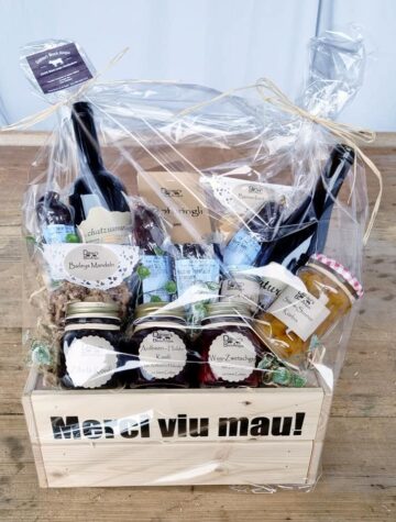 Geschnekkörbe mit regionalen Produkten und einer persönlichen Grussbotschaft.
